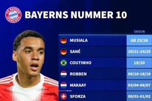直播吧7月1日讯 拜仁官方宣布,穆西亚拉将在世俱杯之后改穿10号球衣,德国转会市场列出了拜仁的10号球员。