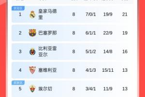 西甲积分榜:皇马重回榜首+2分优势领跑 巴萨客场输球吞赛季首败