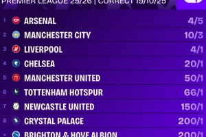 直播吧10月20日讯 利物浦不敌曼联,遭遇联赛三连败。英超夺冠赔率方面,阿森纳以5赔4的赔率成为最大的夺冠热门。曼城以3赔10的赔率位居第二,利物浦则以1赔4的赔率排名第三。