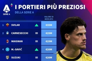直播吧12月25日讯 德国转会市场列出意甲门将身价排名,斯维拉尔3500万欧居首。