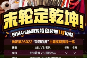 第26022期传足4/6场游戏特色奖期已经于2026年1月25日20:00开售,将于2026年1月28日22:00停售,并于2026年1月29日开奖,其中多特蒙德VS国际米兰、摩纳哥VS尤文图斯、那不勒斯VS切尔西、巴黎圣日尔曼VS纽卡斯尔联为4场进球游戏竞猜赛事。