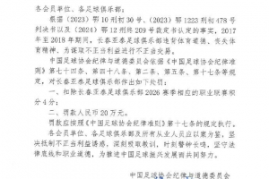 直播吧1月29日讯 中国足协公布足球行业“假赌黑”处罚决定,本赛季降入中甲的长春亚泰足球俱乐部扣4分,罚款20万元。