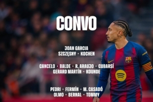 直播吧3月3日讯 北京时间明天凌晨4点,巴萨将在国王杯半决赛次回合比赛中主场对阵马竞,首回合巴萨0-4落败。巴萨公布了此役的球员名单,莱万因眼眶受伤缺席。