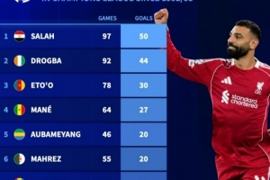 直播吧3月19日讯 在欧冠淘汰赛次回合,利物浦4-0大胜加拉塔萨雷,萨拉赫破门,打进个人生涯欧冠第50球,以下为非洲球员在欧冠改制后射手榜: